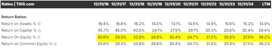 El ROE en Rollins se mueve en niveles extraordinarios de forma persistente: 30,6% en 2016, con un bache a 26,6% en 2019, y subiendo a 37,5% en 2024 y 36,2% LTM. Esto es lo contrario de un negocio que “hace un año bueno”. Y lo mejor: ese ROE no depende de apalancamiento agresivo ni de una narrativa frágil; depende de cosas bastante aburridas y muy difíciles de copiar a la vez: marca, entrenamiento, procesos, densidad, sistemas y una cultura que prioriza compounding antes que cifras artificiales.