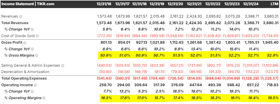 El segundo bloque de sostenibilidad es operativo: la expansión del margen operativo desde 2016 hasta el ~19–20% LTM no es magia financiera.